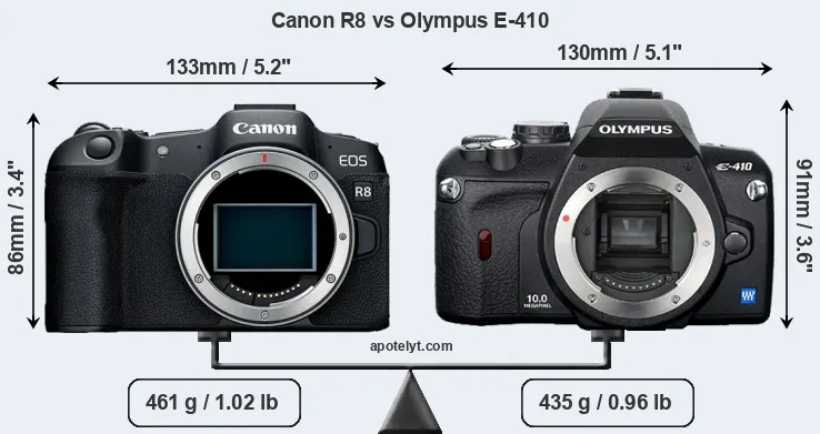 Going beyond this snapshot of core features and characteristics, what are the differences between the Canon EOS R8 and the Olympus E-410? Which one should you buy? Read on to find out how these two cameras compare with respect to their body size, their imaging sensors, their shooting features, their input-output connections, and their reception by expert reviewers.