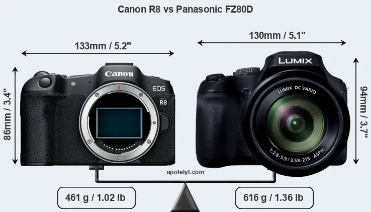 The side-by-side display below illustrates the physical size and weight of the Canon R8 and the Panasonic FZ80D. The two cameras are presented according to their relative size. Three consecutive perspectives from the front, the top, and the back are available. All width, height and depth measures are rounded to the nearest millimeter.