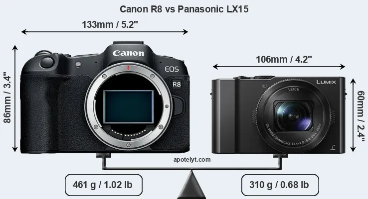 An illustration of the physical size and weight of the Canon R8 and the Panasonic LX15 is provided in the side-by-side display below. The two cameras are presented according to their relative size. Three consecutive perspectives from the front, the top, and the back are available. All size dimensions are rounded to the nearest millimeter.