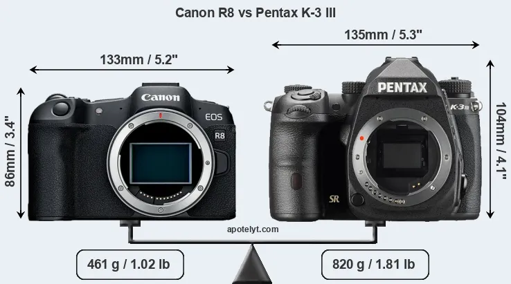 An illustration of the physical size and weight of the Canon R8 and the Pentax K-3 III is provided in the side-by-side display below. The two cameras are presented according to their relative size. Three successive views from the front, the top, and the rear are shown. All size dimensions are rounded to the nearest millimeter.