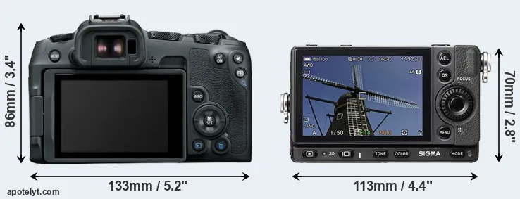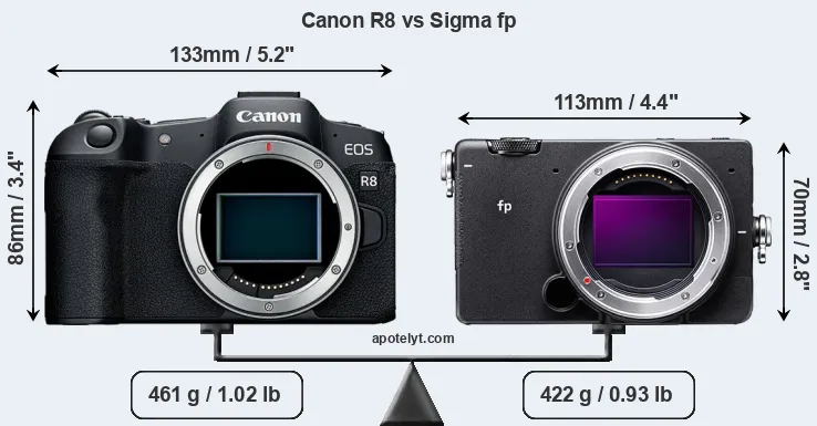 An illustration of the physical size and weight of the Canon R8 and the Sigma fp is provided in the side-by-side display below. The two cameras are presented according to their relative size. Three successive views from the front, the top, and the rear are shown. All width, height and depth measures are rounded to the nearest millimeter.
