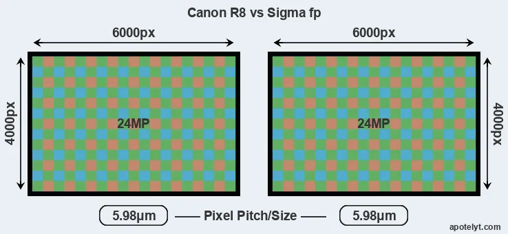 In terms of underlying technology, the R8 is build around a CMOS sensor, while the fp uses a BSI-CMOS imager. Both cameras use a Bayer filter for capturing RGB colors on a square grid of photosensors. This arrangement is found in most digital cameras.