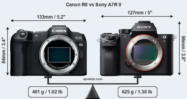 If the front view area (width x height) of the cameras is taken as an aggregate measure of their size, the Sony A7R II is notably larger (7 percent) than the Canon R8. Moreover, the A7R II is substantially heavier (36 percent) than the R8. It is noteworthy in this context that the A7R II is splash and dust-proof, while the R8 does not feature any corresponding weather-sealing.