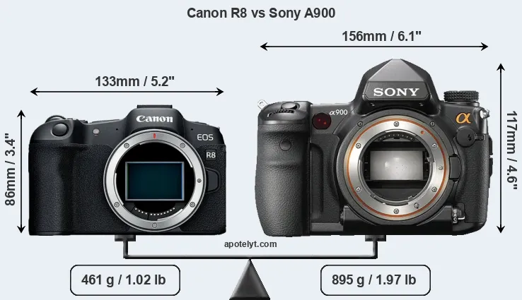 The side-by-side display below illustrates the physical size and weight of the Canon R8 and the Sony A900. The two cameras are presented according to their relative size. Three consecutive perspectives from the front, the top, and the back are available. All width, height and depth dimensions are rounded to the nearest millimeter.