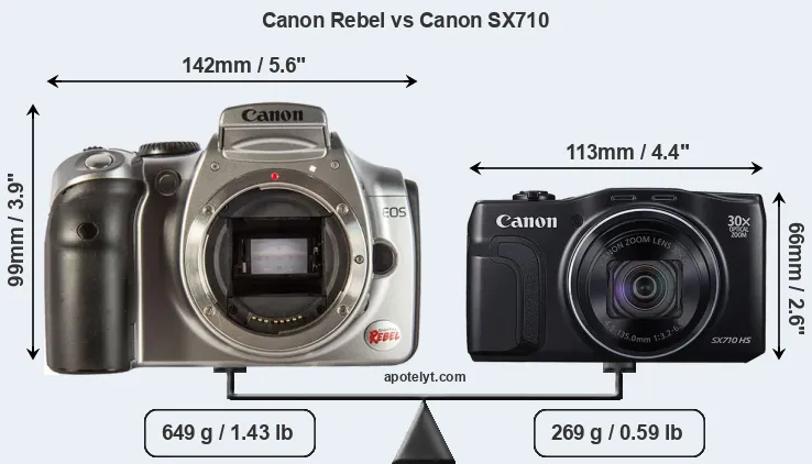 An illustration of the physical size and weight of the Canon Rebel and the Canon SX710 is provided in the side-by-side display below. The two cameras are presented according to their relative size. Three successive views from the front, the top, and the rear are shown. All width, height and depth dimensions are rounded to the nearest millimeter.