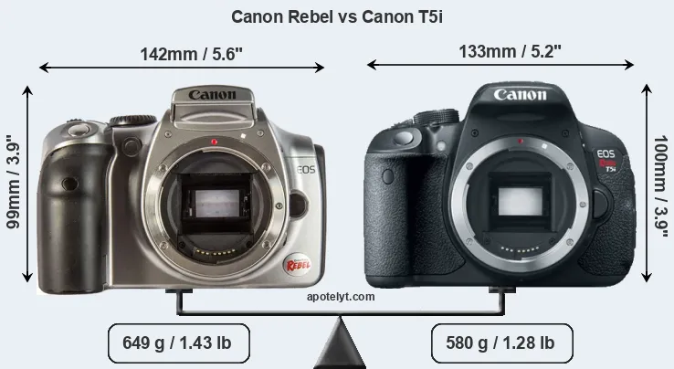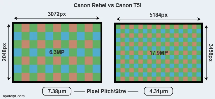 Despite having a slightly smaller sensor, the T5i offers a higher resolution of 17.9 megapixels, compared with 6.3 MP of the Rebel. This megapixels advantage comes at the cost of a higher pixel density and a smaller size of the individual pixel (with a pixel pitch of 4.31μm versus 7.38μm for the Rebel). However, it should be noted that the T5i is much more recent (by 9 years and 7 months) than the Rebel, and its sensor will have benefitted from technological advances during this time that make it possible to gather light more efficiently.