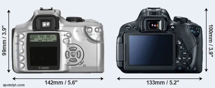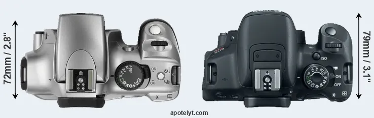 The side-by-side display below illustrates the physical size and weight of the Canon Rebel and the Canon T5i. The two cameras are presented according to their relative size. Three successive views from the front, the top, and the rear are shown. All size dimensions are rounded to the nearest millimeter.