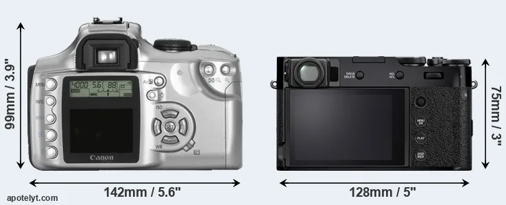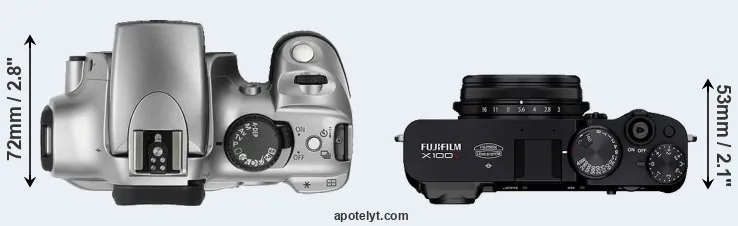 The physical size and weight of the Canon Rebel and the Fujifilm X100V are illustrated in the side-by-side display below. The two cameras are presented according to their relative size. Three consecutive views from the front, the top, and the rear side are shown. All size dimensions are rounded to the nearest millimeter.