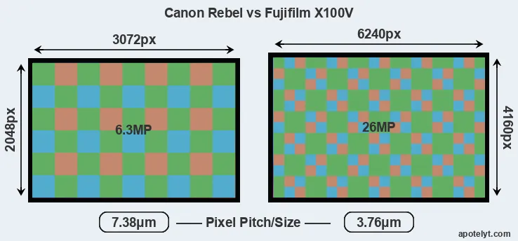 | Sensor Specs | Canon Rebel | Fujifilm X100V |