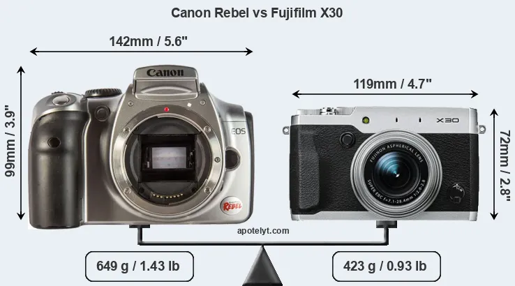 An illustration of the physical size and weight of the Canon Rebel and the Fujifilm X30 is provided in the side-by-side display below. The two cameras are presented according to their relative size. Three successive views from the front, the top, and the rear are shown. All width, height and depth measures are rounded to the nearest millimeter.