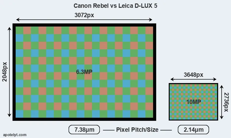 Despite having a smaller sensor, the D-LUX 5 offers a higher resolution of 10 megapixels, compared with 6.3 MP of the Rebel. This megapixels advantage comes at the cost of a higher pixel density and a smaller size of the individual pixel (with a pixel pitch of 2.14μm versus 7.38μm for the Rebel). However, it should be noted that the D-LUX 5 is much more recent (by 7 years and 1 month) than the Rebel, and its sensor will have benefitted from technological advances during this time that make it possible to gather light more efficiently.