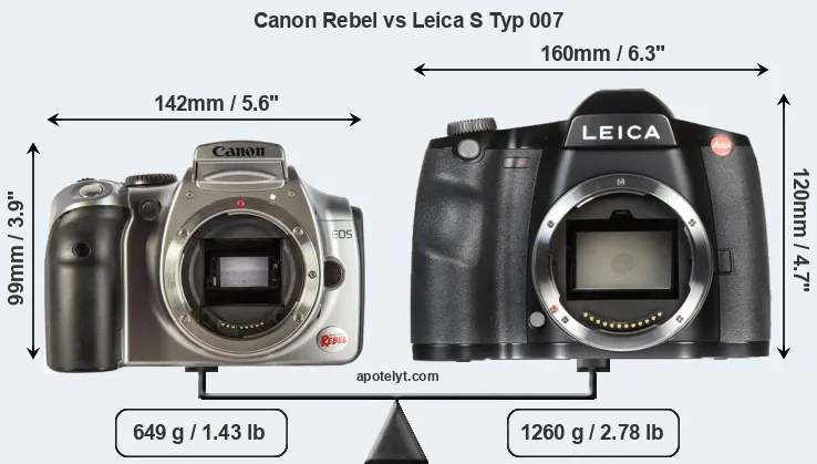 If the front view area (width x height) of the cameras is taken as an aggregate measure of their size, the Leica S Typ 007 is notably larger (37 percent) than the Canon Rebel. Moreover, the S Typ 007 is substantially heavier (94 percent) than the Rebel. It is noteworthy in this context that the S Typ 007 is splash and dust-proof, while the Rebel does not feature any corresponding weather-sealing.