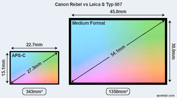 Of the two cameras under consideration, the Canon Rebel features an APS-C sensor and the Leica S Typ 007 a medium format sensor. The sensor area in the S Typ 007 is 294 percent bigger. As a result of these sensor size differences, the cameras have a format factor of, respectively, 1.6 and 0.8. Both cameras have a native aspect ratio (sensor width to sensor height) of 3:2.