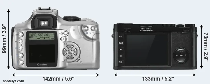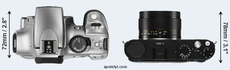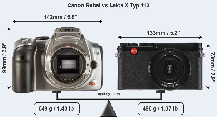 The side-by-side display below illustrates the physical size and weight of the Canon Rebel and the Leica X Typ 113. The two cameras are presented according to their relative size. Three consecutive perspectives from the front, the top, and the back are available. All width, height and depth dimensions are rounded to the nearest millimeter.