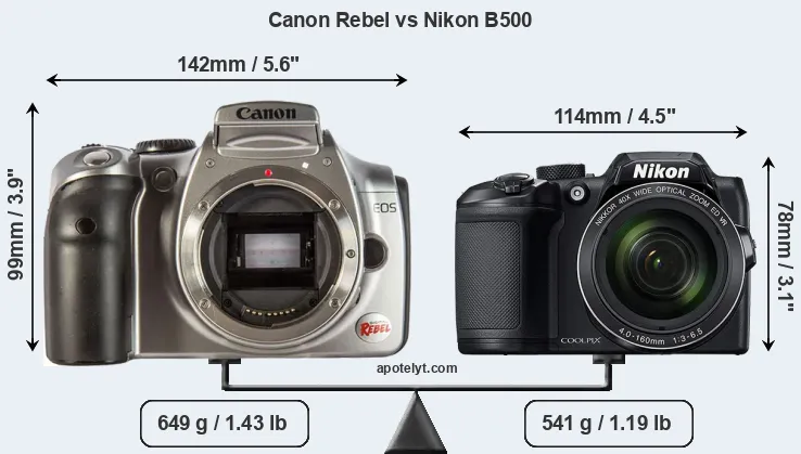 An illustration of the physical size and weight of the Canon Rebel and the Nikon B500 is provided in the side-by-side display below. The two cameras are presented according to their relative size. Three successive views from the front, the top, and the rear are shown. All size dimensions are rounded to the nearest millimeter.