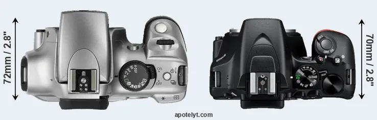 The side-by-side display below illustrates the physical size and weight of the Canon Rebel and the Nikon D3500. The two cameras are presented according to their relative size. Three successive views from the front, the top, and the rear are shown. All width, height and depth measures are rounded to the nearest millimeter.