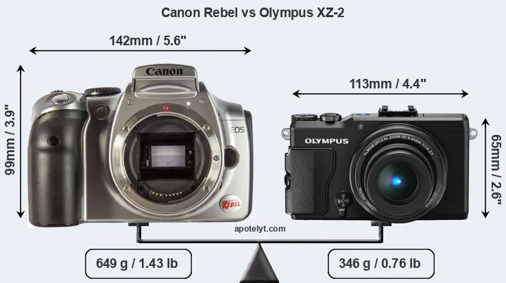 The physical size and weight of the Canon Rebel and the Olympus XZ-2 are illustrated in the side-by-side display below. The two cameras are presented according to their relative size. Three consecutive views from the front, the top, and the rear side are shown. All width, height and depth dimensions are rounded to the nearest millimeter.