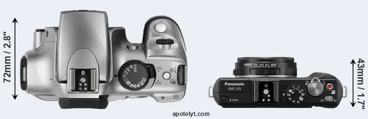 The side-by-side display below illustrates the physical size and weight of the Canon Rebel and the Panasonic LX5. The two cameras are presented according to their relative size. Three consecutive views from the front, the top, and the rear side are shown. All width, height and depth dimensions are rounded to the nearest millimeter.