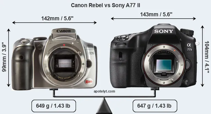 If the front view area (width x height) of the cameras is taken as an aggregate measure of their size, the Sony A77 II is notably larger (6 percent) than the Canon Rebel. However, the A77 II is slightly lighter (0 percent) than the Rebel. It is noteworthy in this context that the A77 II is splash and dust-proof, while the Rebel does not feature any corresponding weather-sealing.