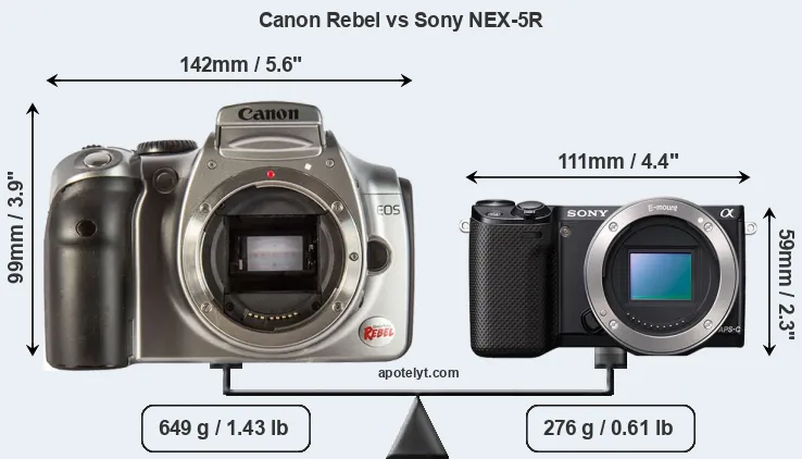 An illustration of the physical size and weight of the Canon Rebel and the Sony NEX-5R is provided in the side-by-side display below. The two cameras are presented according to their relative size. Three consecutive views from the front, the top, and the rear side are shown. All size dimensions are rounded to the nearest millimeter.
