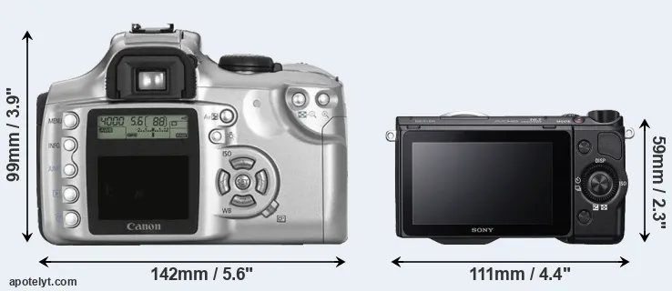 The Canon EOS Digital Rebel (called Canon 300D in some regions) and the Sony Alpha NEX-5R are two digital cameras that were revealed to the public, respectively, in August 2003 and August 2012. The Rebel is a DSLR, while the NEX-5R is a mirrorless interchangeable lens camera. Both cameras are equipped with an APS-C sensor. The Canon has a resolution of 6.3 megapixels, whereas the Sony provides 16 MP.