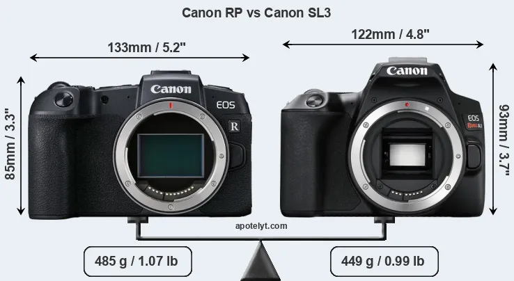 The physical size and weight of the Canon RP and the Canon SL3 are illustrated in the side-by-side display below. The two cameras are presented according to their relative size. Three successive views from the front, the top, and the rear are shown. All width, height and depth measures are rounded to the nearest millimeter.