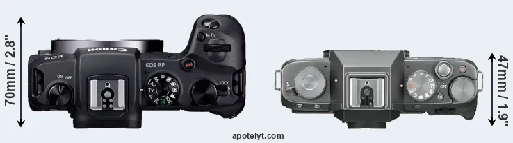 The side-by-side display below illustrates the physical size and weight of the Canon RP and the Fujifilm X-T100. The two cameras are presented according to their relative size. Three successive views from the front, the top, and the rear are shown. All width, height and depth measures are rounded to the nearest millimeter.