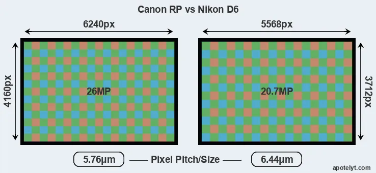 With 26MP, the RP offers a higher resolution than the D6 (20.7MP), but the RP has smaller individual pixels (pixel pitch of 5.76μm versus 6.44μm for the D6). Moreover, the D6 is a somewhat more recent model (by 11 months) than the RP, and its sensor might have benefitted from technological advances during this time that further enhance the light gathering capacity of its pixels.