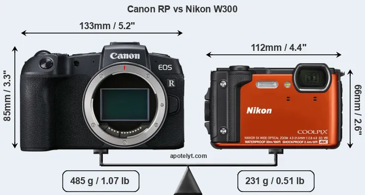 The Canon EOS RP and the Nikon Coolpix W300 are two digital cameras that were revealed to the public, respectively, in February 2019 and May 2017. The RP is a mirrorless interchangeable lens camera, while the W300 is a fixed lens compact. The cameras are based on a full frame (RP) and a 1/2.3-inch (W300) sensor. The Canon has a resolution of 26 megapixels, whereas the Nikon provides 15.9 MP.