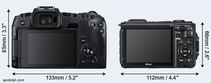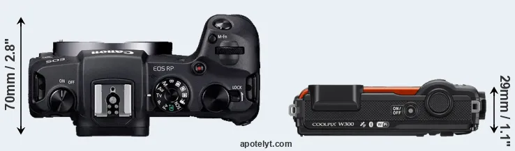 The side-by-side display below illustrates the physical size and weight of the Canon RP and the Nikon W300. The two cameras are presented according to their relative size. Three consecutive perspectives from the front, the top, and the back are available. All size dimensions are rounded to the nearest millimeter.