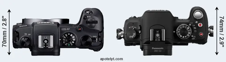 An illustration of the physical size and weight of the Canon RP and the Panasonic G2 is provided in the side-by-side display below. The two cameras are presented according to their relative size. Three consecutive views from the front, the top, and the rear side are shown. All width, height and depth measures are rounded to the nearest millimeter.