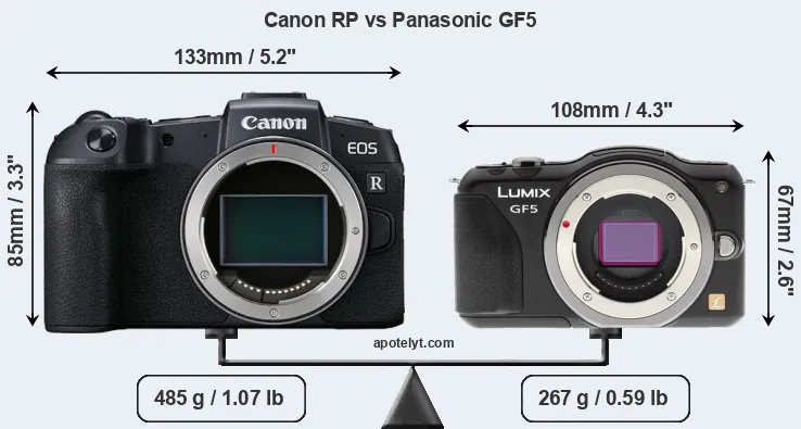An illustration of the physical size and weight of the Canon RP and the Panasonic GF5 is provided in the side-by-side display below. The two cameras are presented according to their relative size. Three consecutive views from the front, the top, and the rear side are shown. All width, height and depth measures are rounded to the nearest millimeter.