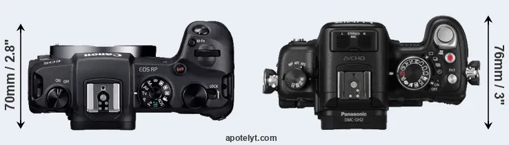 The side-by-side display below illustrates the physical size and weight of the Canon RP and the Panasonic GH2. The two cameras are presented according to their relative size. Three consecutive views from the front, the top, and the rear side are shown. All width, height and depth dimensions are rounded to the nearest millimeter.
