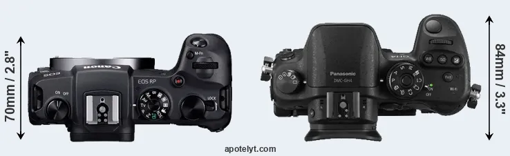 The physical size and weight of the Canon RP and the Panasonic GH4 are illustrated in the side-by-side display below. The two cameras are presented according to their relative size. Three consecutive views from the front, the top, and the rear side are shown. All width, height and depth measures are rounded to the nearest millimeter.