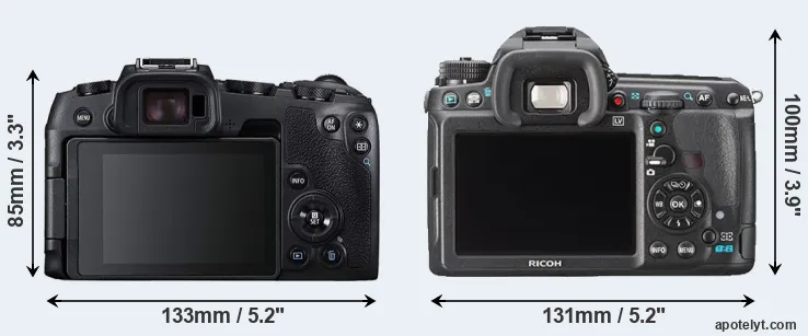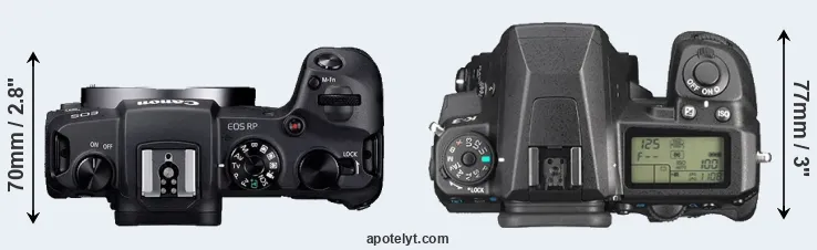 The physical size and weight of the Canon RP and the Pentax K-3 are illustrated in the side-by-side display below. The two cameras are presented according to their relative size. Three successive views from the front, the top, and the rear are shown. All size dimensions are rounded to the nearest millimeter.