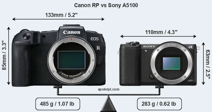 The Canon EOS RP and the Sony Alpha A5100 are two digital cameras that were revealed to the public, respectively, in February 2019 and August 2014. Both the RP and the A5100 are mirrorless interchangeable lens cameras that are based on a full frame (RP) and an APS-C (A5100) sensor. The Canon has a resolution of 26 megapixels, whereas the Sony provides 24 MP.