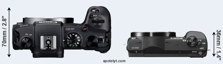 The physical size and weight of the Canon RP and the Sony A5100 are illustrated in the side-by-side display below. The two cameras are presented according to their relative size. Three consecutive views from the front, the top, and the rear side are shown. All size dimensions are rounded to the nearest millimeter.