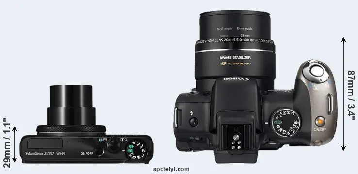 The side-by-side display below illustrates the physical size and weight of the Canon S120 and the Canon SX20. The two cameras are presented according to their relative size. Three successive views from the front, the top, and the rear are shown. All size dimensions are rounded to the nearest millimeter.