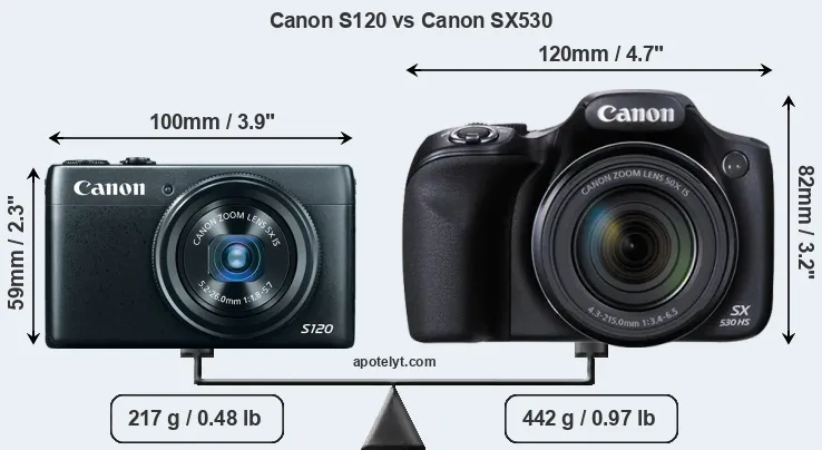 If the front view area (width x height) of the cameras is taken as an aggregate measure of their size, the Canon SX530 is considerably larger (67 percent) than the Canon S120. Moreover, the SX530 is substantially heavier (104 percent) than the S120. In this context, it is worth noting that neither the S120 nor the SX530 are weather-sealed.