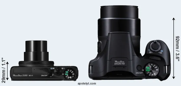 The physical size and weight of the Canon S120 and the Canon SX530 are illustrated in the side-by-side display below. The two cameras are presented according to their relative size. Three consecutive perspectives from the front, the top, and the back are available. All size dimensions are rounded to the nearest millimeter.