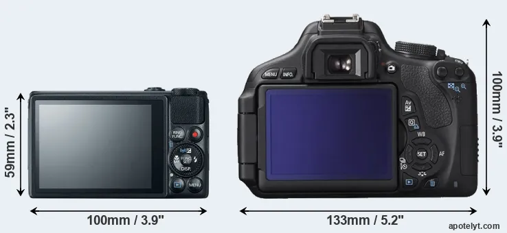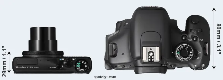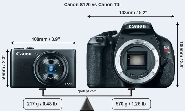 The side-by-side display below illustrates the physical size and weight of the Canon S120 and the Canon T3i. The two cameras are presented according to their relative size. Three consecutive perspectives from the front, the top, and the back are available. All width, height and depth measures are rounded to the nearest millimeter.