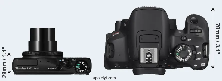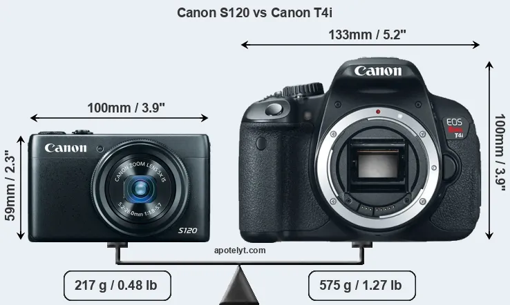 The side-by-side display below illustrates the physical size and weight of the Canon S120 and the Canon T4i. The two cameras are presented according to their relative size. Three consecutive perspectives from the front, the top, and the back are available. All width, height and depth measures are rounded to the nearest millimeter.
