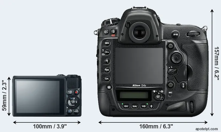If the front view area (width x height) of the cameras is taken as an aggregate measure of their size, the Nikon D4S is considerably larger (326 percent) than the Canon S120. It is noteworthy in this context that the D4S is splash and dust-proof, while the S120 does not feature any corresponding weather-sealing.