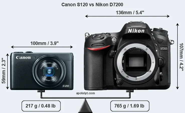 An illustration of the physical size and weight of the Canon S120 and the Nikon D7200 is provided in the side-by-side display below. The two cameras are presented according to their relative size. Three consecutive views from the front, the top, and the rear side are shown. All width, height and depth measures are rounded to the nearest millimeter.