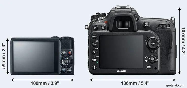 If the front view area (width x height) of the cameras is taken as an aggregate measure of their size, the Nikon D7200 is considerably larger (147 percent) than the Canon S120. It is noteworthy in this context that the D7200 is splash and dust-proof, while the S120 does not feature any corresponding weather-sealing.
