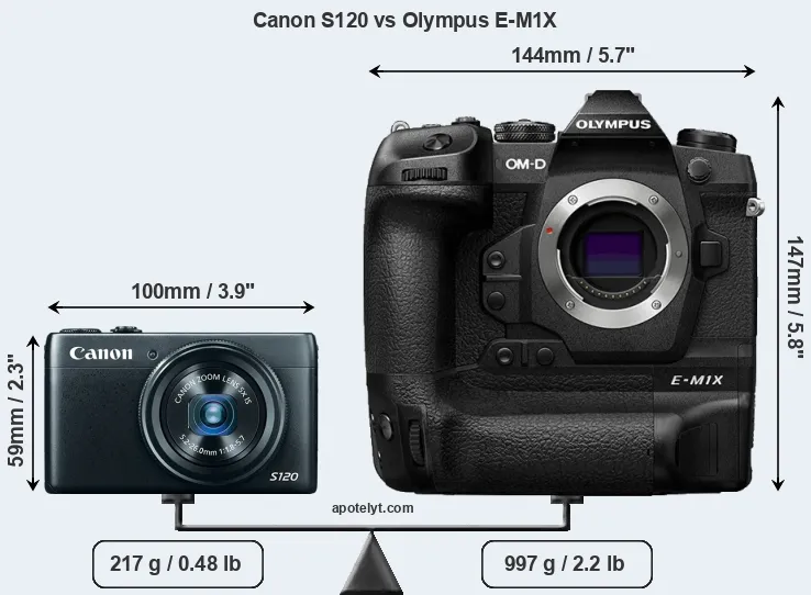 If the front view area (width x height) of the cameras is taken as an aggregate measure of their size, the Olympus E-M1X is considerably larger (259 percent) than the Canon S120. It is noteworthy in this context that the E-M1X is splash and dust-proof, while the S120 does not feature any corresponding weather-sealing.