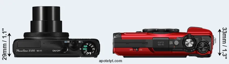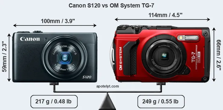 An illustration of the physical size and weight of the Canon S120 and the OM System TG-7 is provided in the side-by-side display below. The two cameras are presented according to their relative size. Three successive views from the front, the top, and the rear are shown. All size dimensions are rounded to the nearest millimeter.