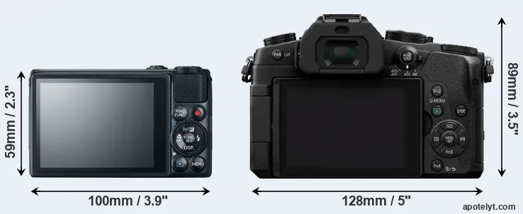 If the front view area (width x height) of the cameras is taken as an aggregate measure of their size, the Panasonic G85 is considerably larger (93 percent) than the Canon S120. It is noteworthy in this context that the G85 is splash and dust-proof, while the S120 does not feature any corresponding weather-sealing.