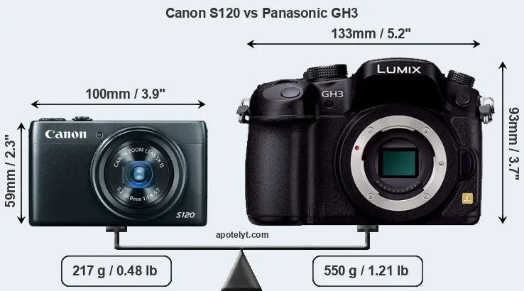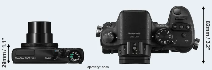 The side-by-side display below illustrates the physical size and weight of the Canon S120 and the Panasonic GH3. The two cameras are presented according to their relative size. Three successive views from the front, the top, and the rear are shown. All width, height and depth measures are rounded to the nearest millimeter.