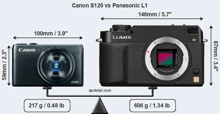 An illustration of the physical size and weight of the Canon S120 and the Panasonic L1 is provided in the side-by-side display below. The two cameras are presented according to their relative size. Three consecutive perspectives from the front, the top, and the back are available. All width, height and depth measures are rounded to the nearest millimeter.